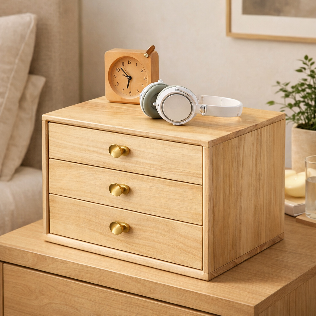 Dieser Aufbewahrungsschrank mit drei Schubladen ist aus warmem Naturholz gefertigt und verleiht Ihrem Zuhause einen schlichten und natürlichen Stil, der sich in verschiedene Räume einfügt. Sein kompaktes und funktionales Design ermöglicht die übersichtliche Aufbewahrung von Kleinigkeiten wie Schreibwaren, Schmuck oder anderen Alltagsgegenständen und sorgt so für einen aufgeräumten Schreibtisch. Die Schubladen lassen sich leicht öffnen und schließen, und die runden Metallgriffe unterstreichen die hochwertige Verarbeitung und gewährleisten gleichzeitig hohen Bedienkomfort. Auf der Ablagefläche finden häufig genutzte Gegenstände wie Wecker und Kopfhörer Platz und dienen gleichzeitig als Aufbewahrungs- und Präsentationsfläche. Dank seiner praktischen Größe eignet er sich ideal als Nachttisch im Schlafzimmer, auf dem Schreibtisch oder im Büro und bietet eine praktische Lösung für den Alltag.